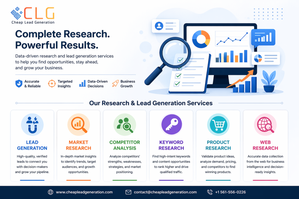 We specialize in providing comprehensive research and lead generation services tailored to propel your business forward. Our expertise lies in harnessing the power of data and insights to connect you with your ideal customers and competitors, ensuring you stay ahead in your industry.